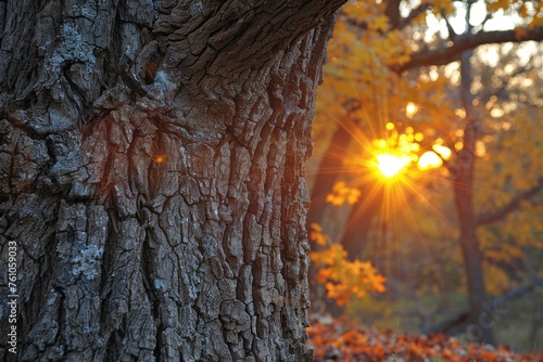 Obraz premium Sunset rays peeking through autumn trees, highlighting tree bark texture.