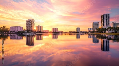 © The Little Hut, Fototapeta premium Sunset reflecting off of Mirror Lake in downtown St Petersburg Florida : Generative AI