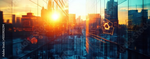 © Emma, Fototapeta premium Sunset reflecting off sleek city towers