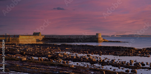 © James, Obraz premium Sunset Reflecting off the harbour Walls of Old Saltcoats Pier on the Clyde in Scotland.