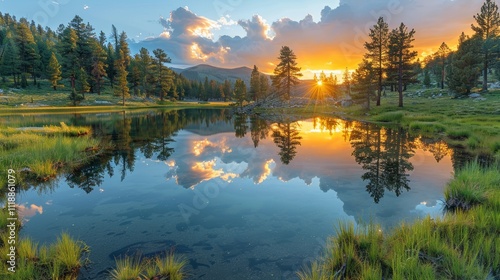 © July Wonkaa, Fototapeta premium Sunset reflecting on calm lake in mountain forest.