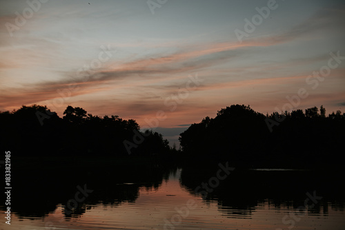 © Cavan, Fototapeta premium Sunset reflecting on calm lake water with dark forest silhouette