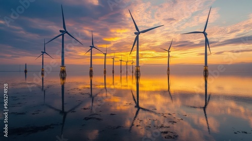 © SITTAKAN, Fototapeta premium Sunset reflecting on wind turbines in shallow coastal waters, calm and golden, a serene image of renewable energy