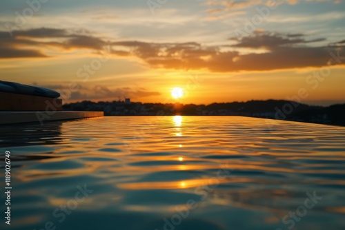 © Lumevia, Obraz premium Sunset Reflection in Infinity Pool Overlooking Cityscape