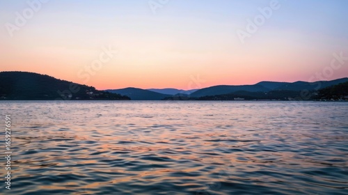 Fototapeta premium Sunset Reflection on a Calm Lake with Distant Hills
