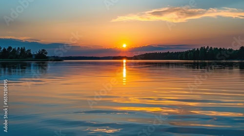 © Gank, Fototapeta premium Sunset Reflection on a Calm Lake with Distant Hills