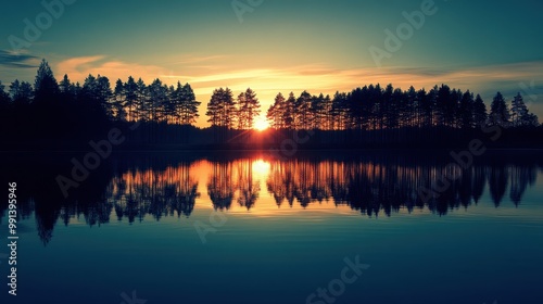 © AriyaniAI, Fototapeta premium Sunset Reflection on a Still Lake
