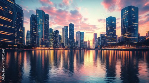 © Oppilamani, Fototapeta premium Sunset Reflections of Illuminated Skyscrapers on a Serene Riverfront Cityscape, With Their Glow Casting on the Water