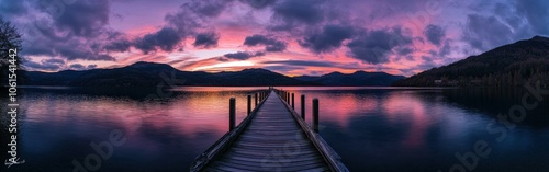 © BrandwayArt, Fototapeta premium Sunset reflections over calm lake with dock surrounded by mountains