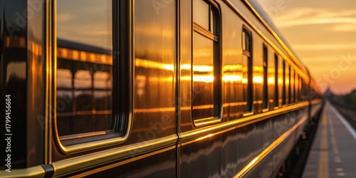 © Thanate, Fototapeta premium Sunset reflects off a sleek train, highlighting its polished surface along a tranquil platform.