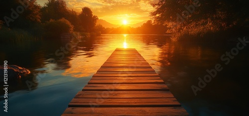 © Design By Reiga, Fototapeta premium Sunset river dock, calm water, golden hour