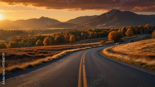 © Halim Karya Art, Fototapeta premium sunset,Road in autumn leading through a valley with mountains and a bright sunset