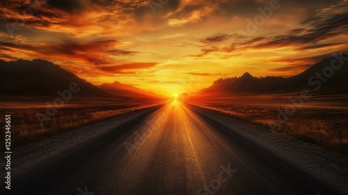 Fototapeta premium Sunset road journey, mountain landscape, fiery sky