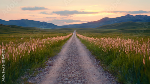 © tugkiara, Naklejka premium Sunset road through grassy plains, mountains background, travel photography