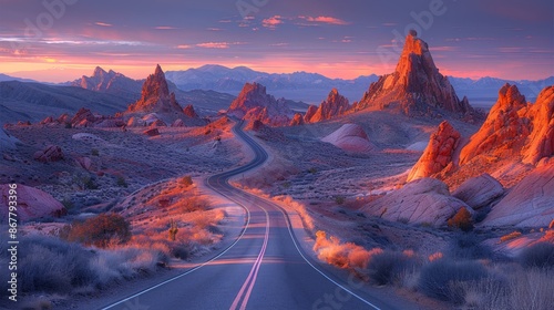 Obraz premium Sunset Road Through Majestic Red Rock Mountains - Generative AI