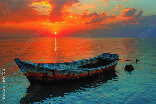 © Tuong, Fototapeta premium Sunset's Canvas: Tranquil Sea Embrace Ignites Horizon with Fiery Hues