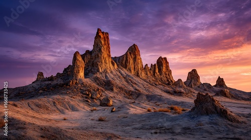 © Patipan, Fototapeta premium Sunset's Embrace: A breathtaking landscape of rugged rock formations under a vibrant sunset sky.
