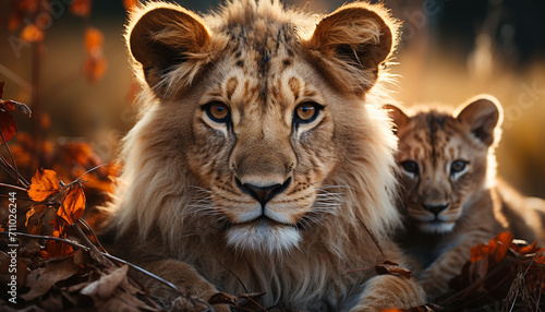 © Jemastock, Fototapeta premium Sunset safari, Lion cub hides in grass generated by AI
