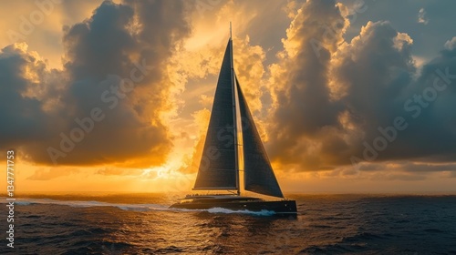 © Badrun, Fototapeta premium Sunset Sailboat at Sea, Dramatic Clouds