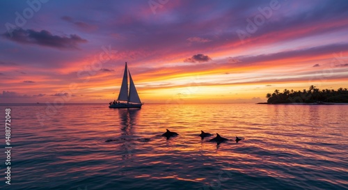 © Naru, Fototapeta premium Sunset Sailboat Dolphins Paradise - Peaceful sunset scene, sailboat at sea, dolphins swimming, vibrant colors, serene nature. Symbolizing freedom, tranquility, harmony, adventure, and peace