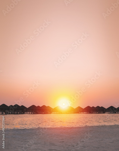 Fototapeta premium Sunset scene at Maldives beach, luxury water lodges. Travel destinations