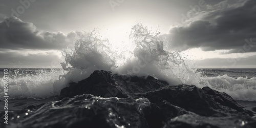 Obraz premium Sunset scene with waves hitting rocks and water spray against a cloud-filled...