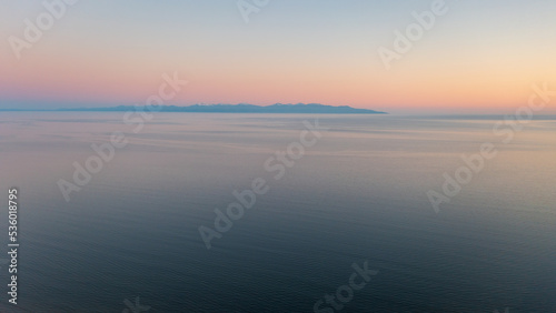 © Andrei Stepanov, Fototapeta premium Sunset seascape. Aerial view of the sea. Mountains in the distance. Ripples on the surface of the water. Beautiful natural background. Perfect for design.
