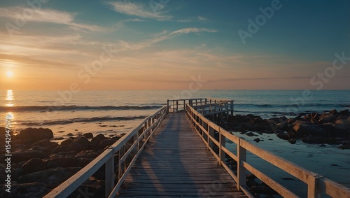 © Sunny, Fototapeta premium Sunset Serenity: A Wooden Boardwalk Leading to the Horizon