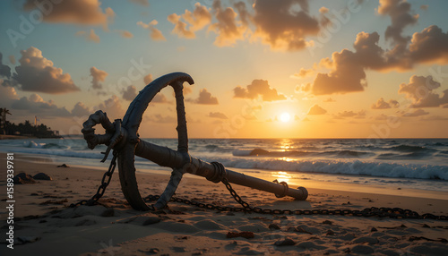 Fototapeta premium Sunset Serenity: Anchor on Golden Shore