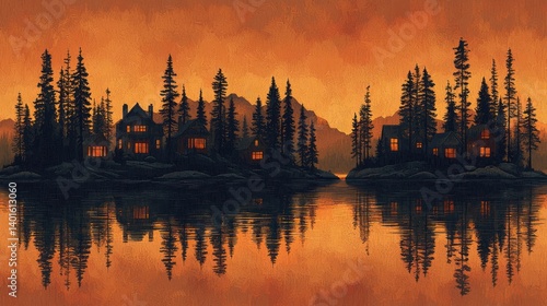 © Cumam, Fototapeta premium Sunset Serenity: Lakeside Cabins and Mountain Reflections