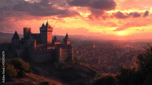 Fototapeta premium Sunset Serenity over Carcassonne: A Medieval Fortress Illuminated in the Heart of France