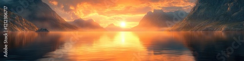 Naklejka premium Sunset Serenity over Norwegian Fjords, vibrant orange sky reflecting on...