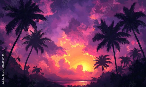 © dewpra, Naklejka premium Sunset Serenity, Palm Trees Cast in Silhouette by a Spectacular Purple and Pink Sky