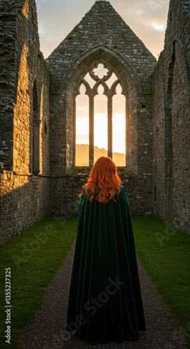 © A Denny Syahputra, Naklejka premium Sunset Silhouette: A Woman in Green at a Historic Abbey