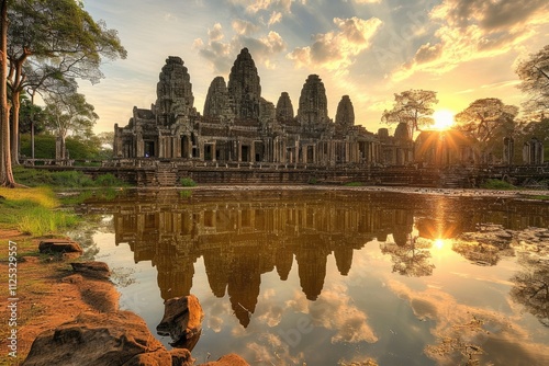 © Mykola, Obraz premium Sunset Silhouette: Bayon Temple, Cambodia's Ancient Architectural Marvel