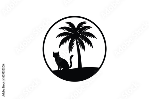 Fototapeta premium Sunset Silhouette Palm Tree Black Cat Stretching and Colorful Sky Illustration