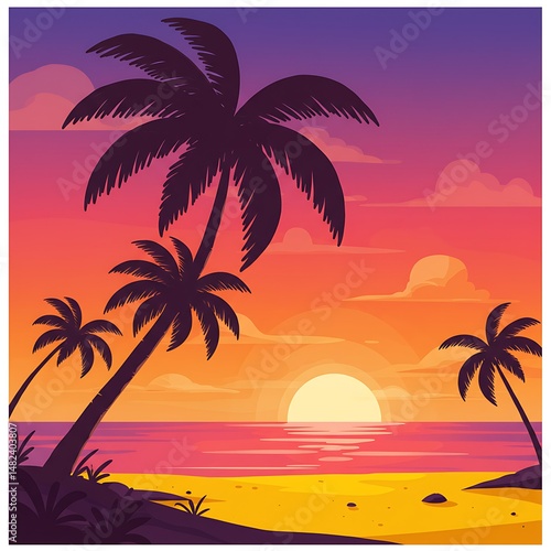 © Yukiiii, Obraz premium Sunset Silhouette: Tropical Vector Art