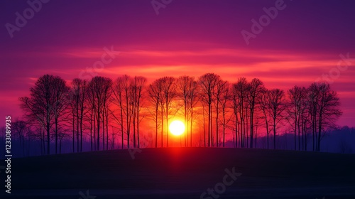 © banyu bening, Fototapeta premium Sunset silhouettes, trees, field, vibrant sky, nature