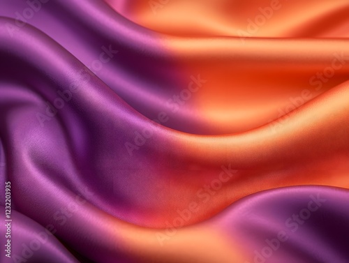 Fototapeta premium Sunset Silk Drape: Luxurious silk fabric in a vibrant ombre blend of purple and orange, creating a dramatic and elegant swirl of color and texture.