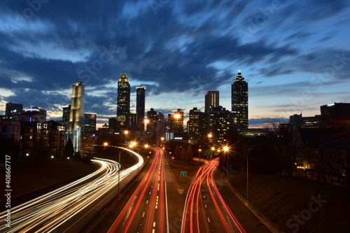 Fototapeta premium Sunset sky and traffic in Downtown Atlanta