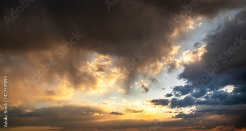 Fototapeta premium Sunset sky background. Beautiful sunset after rain, with bright orange dramatic clouds.