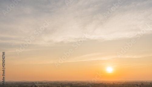 © Nature Peaceful , Fototapeta premium Sunset sky clouds in the evening over mountain with golden hour orange, yellow sunlight sun dawn, Horizon landscape dusk sky background