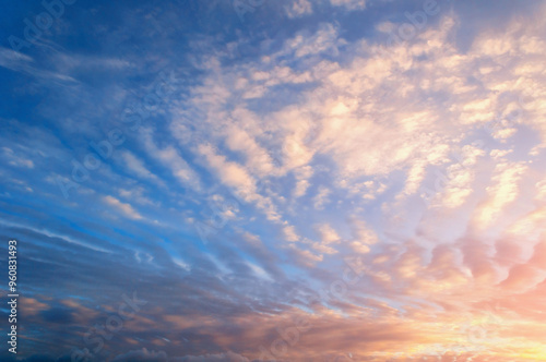 Fototapeta premium Sunset sky clouds with real sun beams, natural sunset sky background, colorful sunset sky landscape