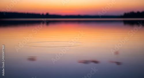 Obraz premium Sunset sky mirrored on a quiet lake, soft focus and cinematic tones.
