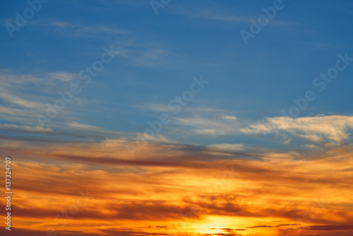 © lunamarina, Fototapeta premium Sunset sky orange clouds over blue