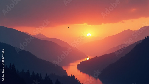 © javed, Obraz premium Sunset Sky Over Misty Mountain Layers
