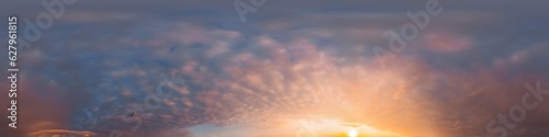 Obraz premium Sunset sky panorama with dramatic bright glowing pink Cumulus clouds. HDR 360 seamless spherical panorama. Full zenith or sky dome for 3D visualization, sky replacement for aerial drone panoramas.