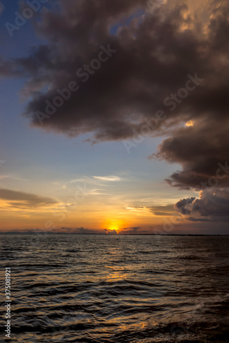 Naklejka premium Sunset sky with cloud and silhouette mountain at the lake in golden time.