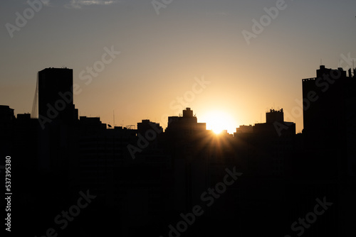Naklejka premium Sunset sky with dramatic buildings silhouette in the historic center of São Paulo, Brazil - Pôr do sol com dramática silhueta de prédios no centro