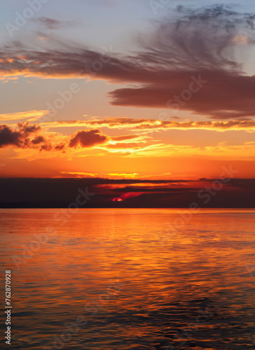 Naklejka premium Sunset sky with reflections in water, sunlight and colored orange clouds